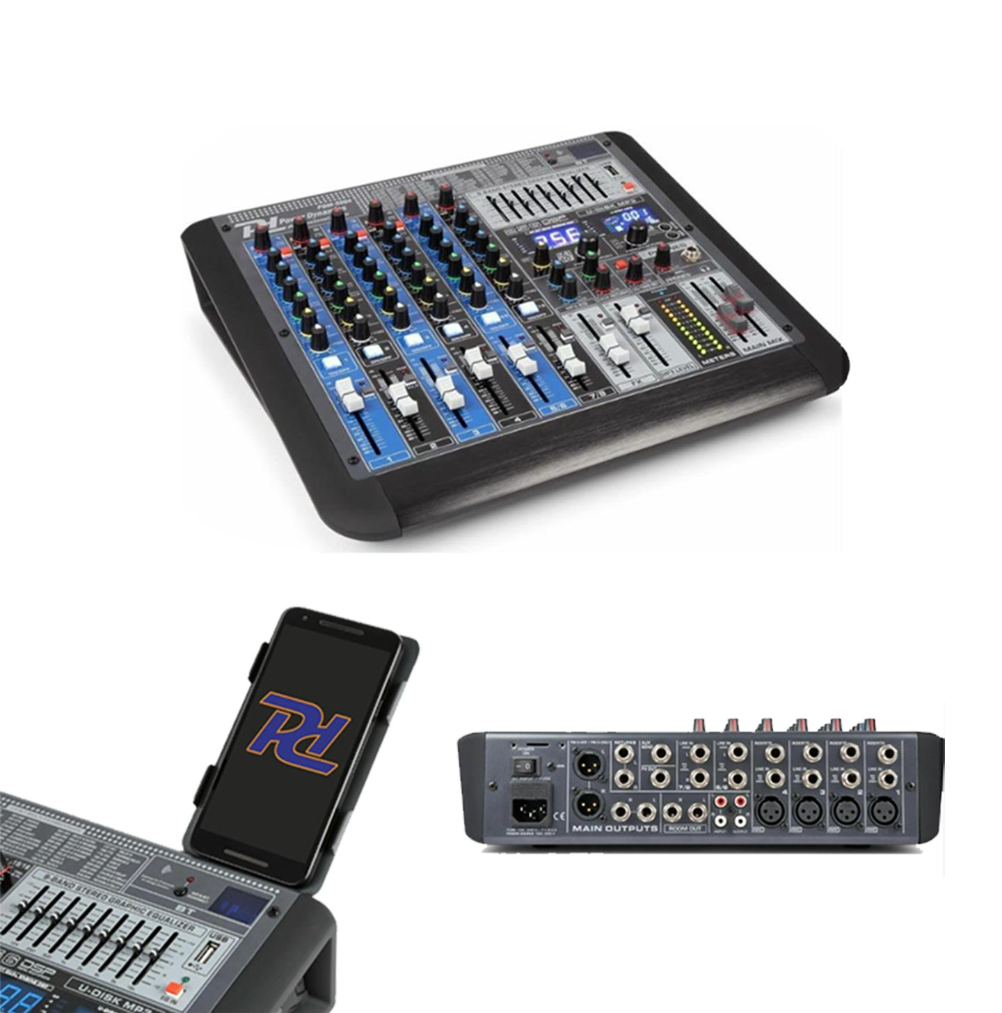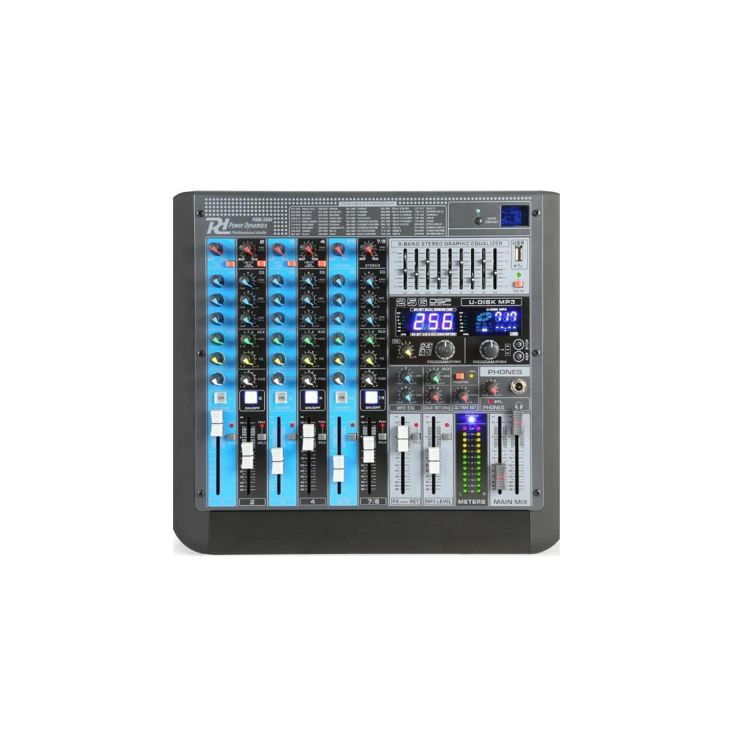 Taula de mescles de 12 canals, 4 entrades de micròfon/línia, EQ de 3 bandes en tots els canals, filtre pas baix (75 Hz), alimentació phantom per micròfons de condensador, 4 entrades de línia estèreo de 1/4”, 12 efectes integrats, entrades/sortides RCA estèreo dedicades, fader de 60 mm per a les sortides principals L/R, sortides estèreo d’auriculars i sala de control.